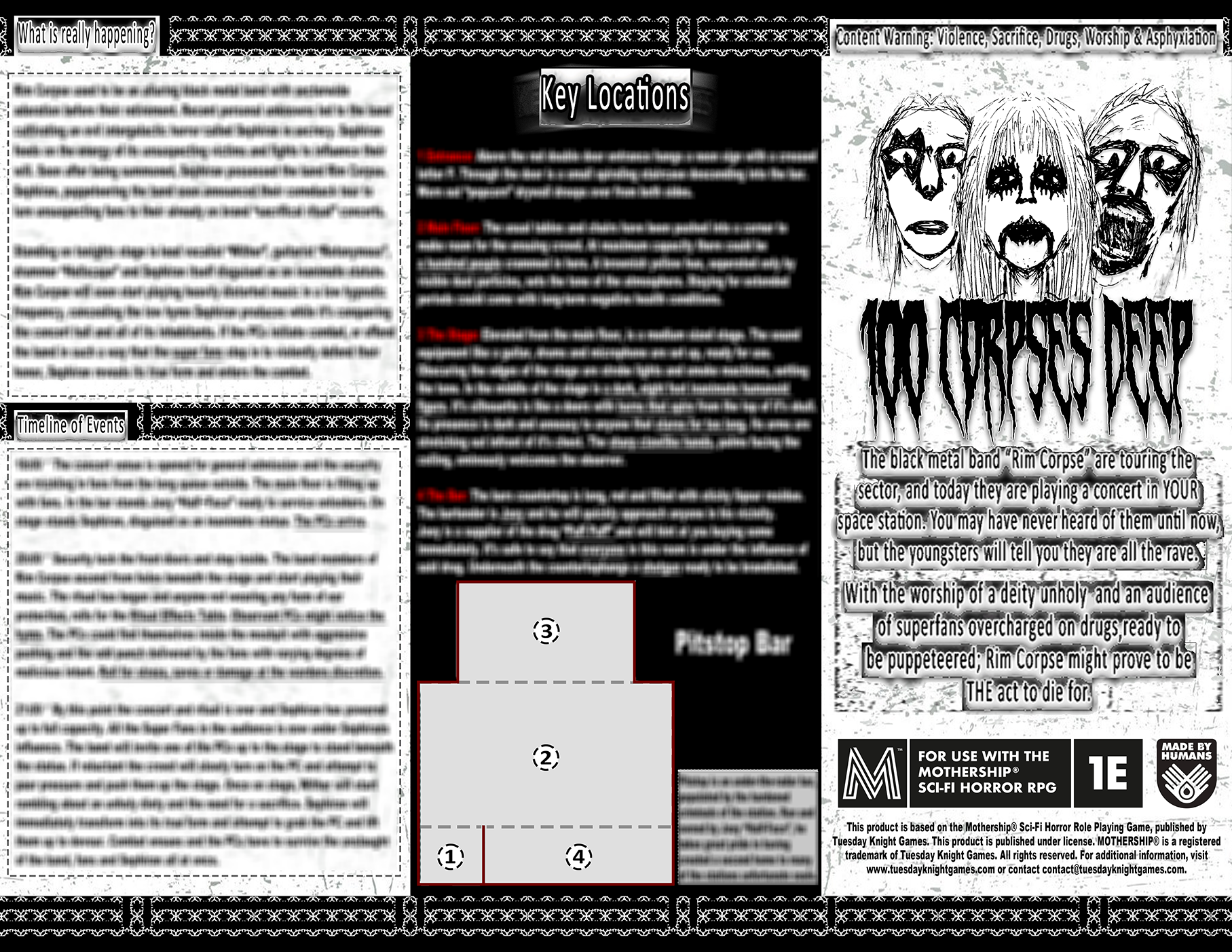 100 Corpses Deep is a trifold pamphlet mini-scenario for the first edition of the Mothership Sci-fi Horror TTRPG, designed to be played in one session. A concert encounter, in a shady underbelly bar, designed to be stumbled upon, hinted and/or weaved in between missions in a long-form campaign.