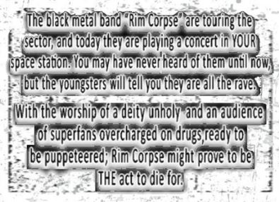 The black metal band "Rim Corpse" are touring the sector, and today they are playing a concert in YOUR space station. You may have never heard of them until now, but the youngsters will tell you they are all the rave.